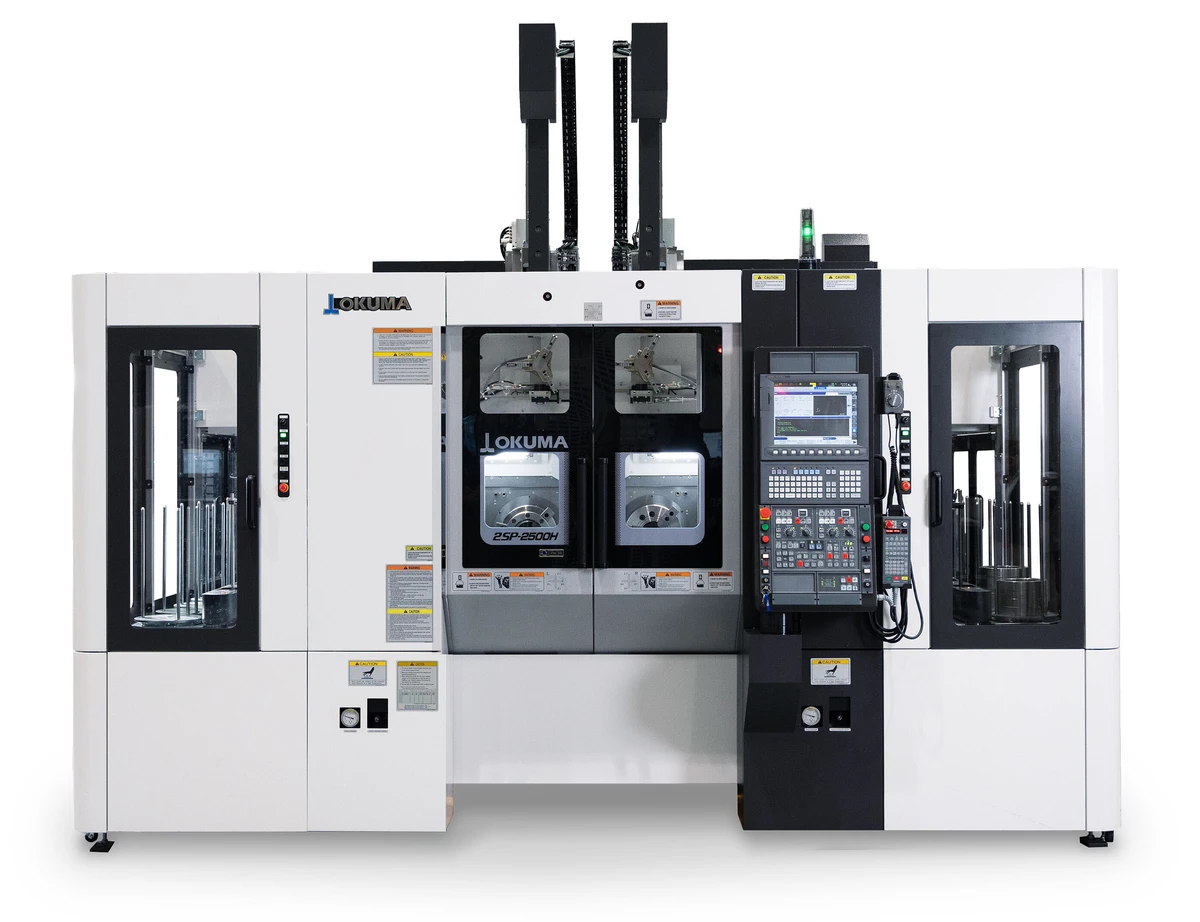 The innovative front-facing spindle of our 2SP-2500H helps create an automation-friendly lathe for small parts production. By moving the spindle off the side and incorporating the Okuma Gantry Loader (OGL) into the production line, parts can be loaded and unloaded automatically. An extremely compact footprint improves floor space utilization, while the popular dual spindle option significantly reduces cycle time.